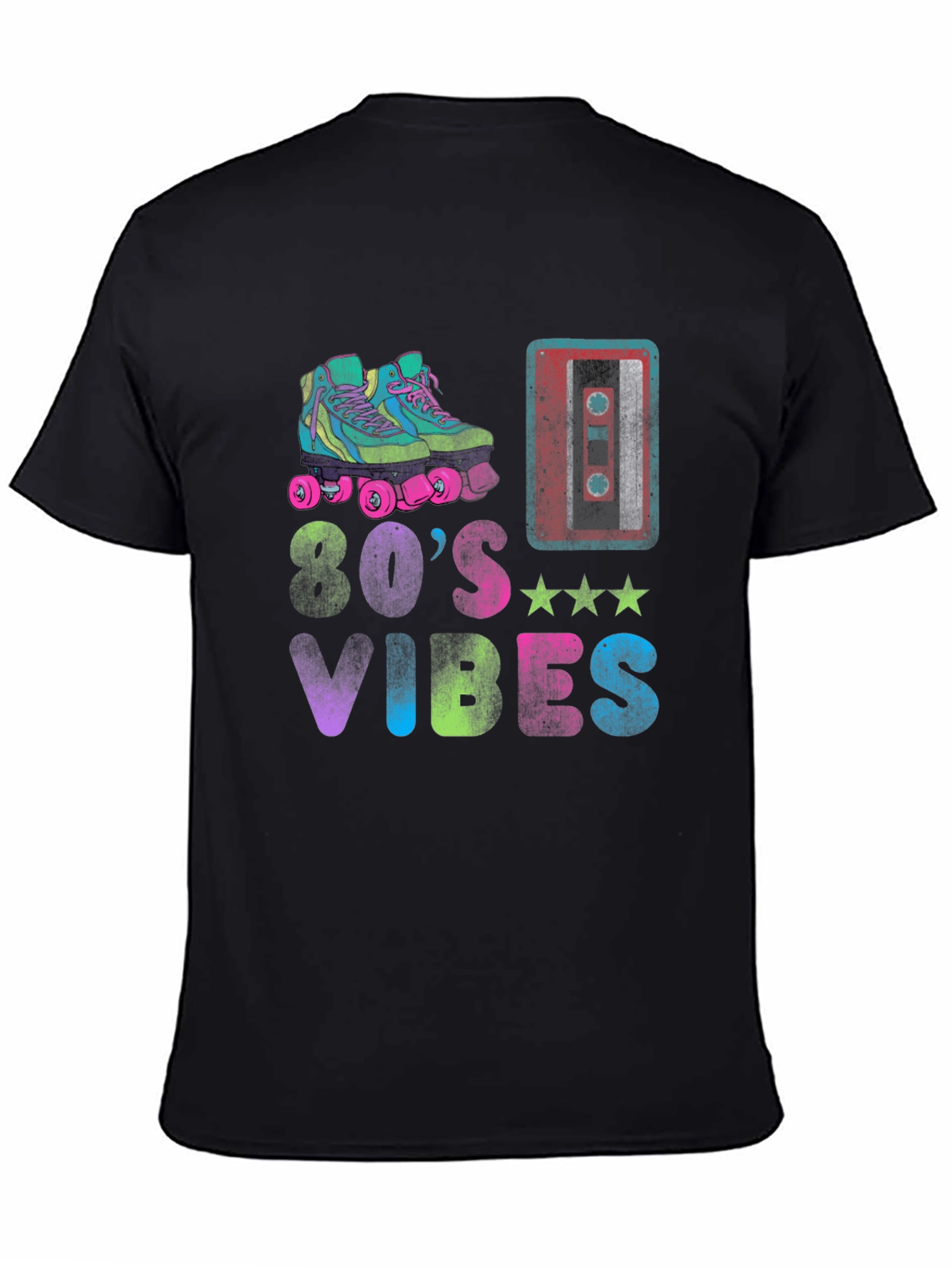 Step back in time with this vibrant 80's Vibes graphic t-shirt! This eye-catching tee features a bold design showcasing roller skates, a cassette tape, and the words "80's Vibes" in bright, retro colors. The distressed print adds a touch of vintage charm, while the classic black background ensures versatility. Made from a soft and comfortable fabric, this t-shirt is perfect for casual wear, parties, or anyone who loves the iconic style of the 80s. Express your love for the decade of big hair and neon colors with this unique and stylish t-shirt!