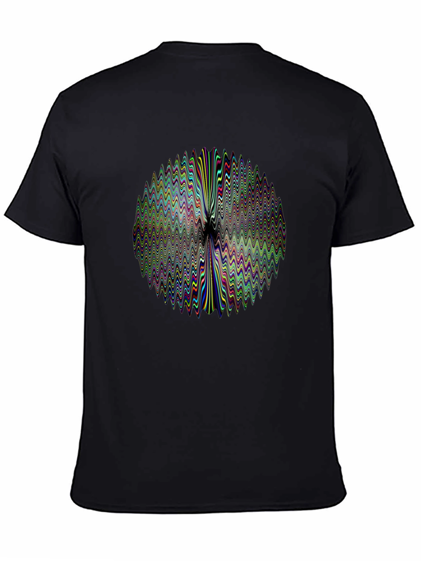 This eye-catching black t-shirt features a mesmerizing abstract design. A circle is filled with colorful, wavy lines creating a dynamic and psychedelic effect. The vivid colors pop against the dark background of the tee, making it a standout piece. Made from a comfortable, breathable fabric, this t-shirt is perfect for everyday wear. Whether you're hitting the streets, lounging at home, or heading to a casual hangout, this t-shirt adds a touch of artistic flair to any outfit. Its unique graphic ensures you'll turn heads and spark conversations. A must-have for those who appreciate bold and unconventional style.